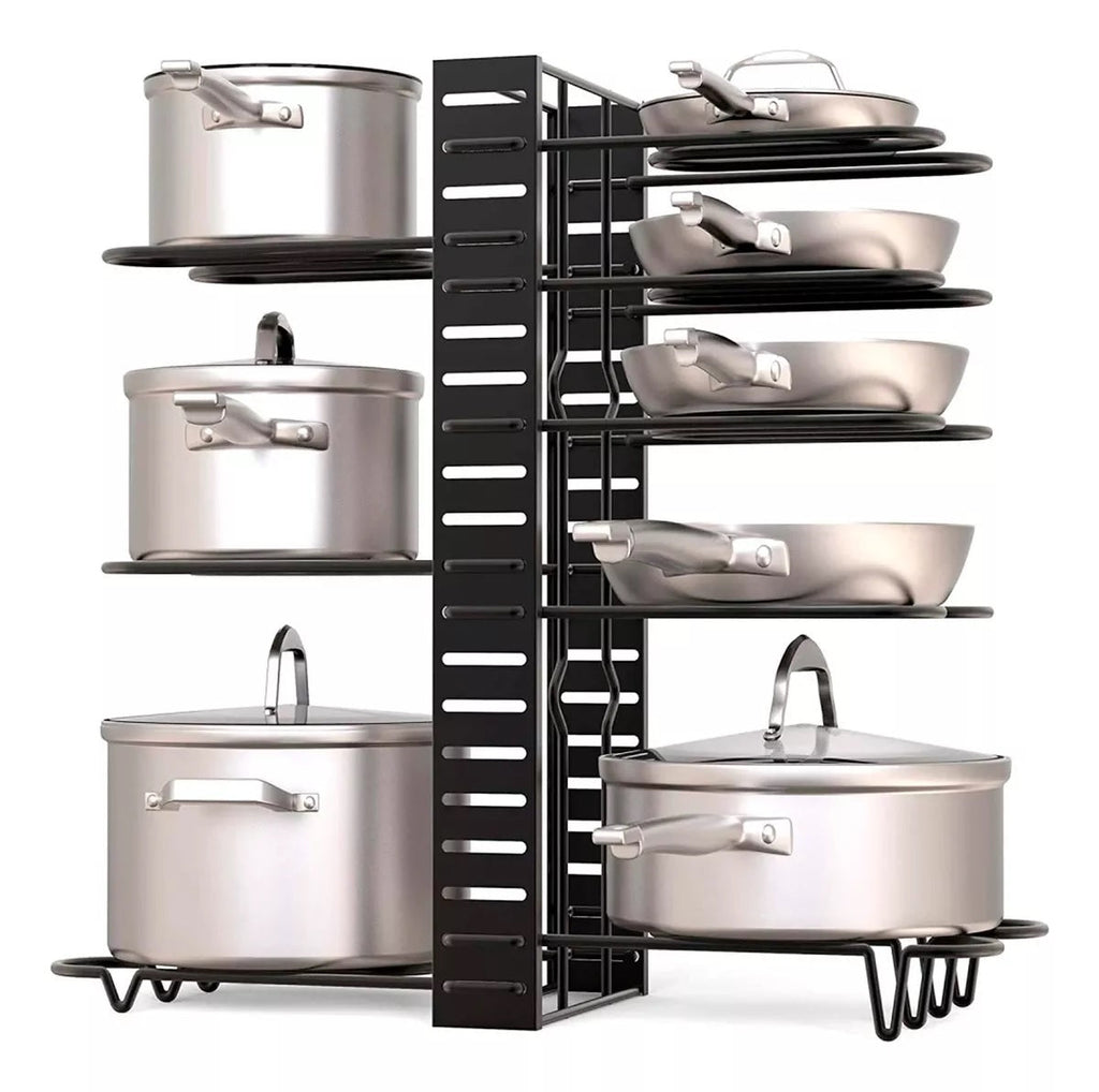 Gran capacidad de almacenamiento: estos soportes de olla ajustables en altura y posición almacenan hasta 8 sartenes, planchas o ollas de varios tamaños Construcción sólida: Este organizador de estante para ollas hecho de hierro resistente con proceso de pintura en aerosol terminado. Es muy firme y elegante Permita una ligera diferencia de dimensión de 3 a 5 cm debido a las diferentes medidas manuales